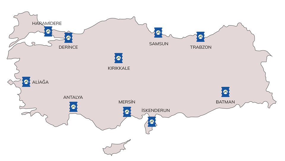 İkmal ağımız Trabzon, Samsun, Kırıkkale, Derince, Haramidere, Aliağa, Antalya, Mersin, İskenderun ve Batman’da bulunan toplam 10 akaryakıt terminalinden oluşmaktadır.
